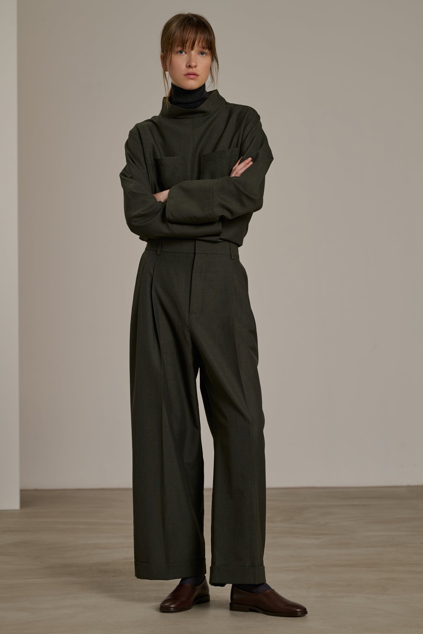 Pleated trousers in speckled wool canvas khaki