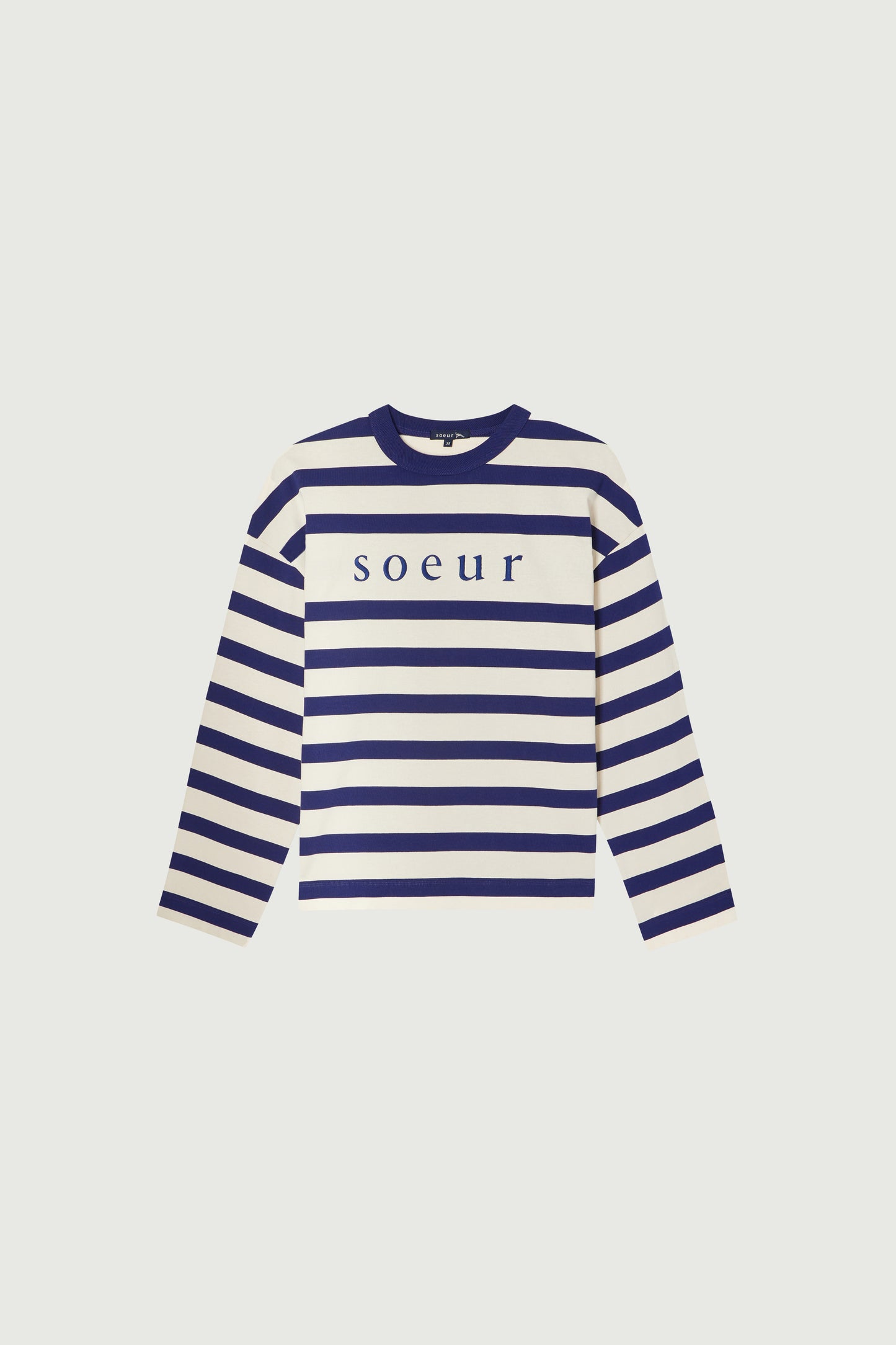 ARCHIE is our new sailor-stripe shirt. This version, sporting wide off-white and blue stripes, is made from organic cotton jersey. Its decidedly oversized cut can be worn as a relaxed T-shirt against the skin, or layered like a thin sweatshirt. The 'Soeur' logo is embroidered on the front.